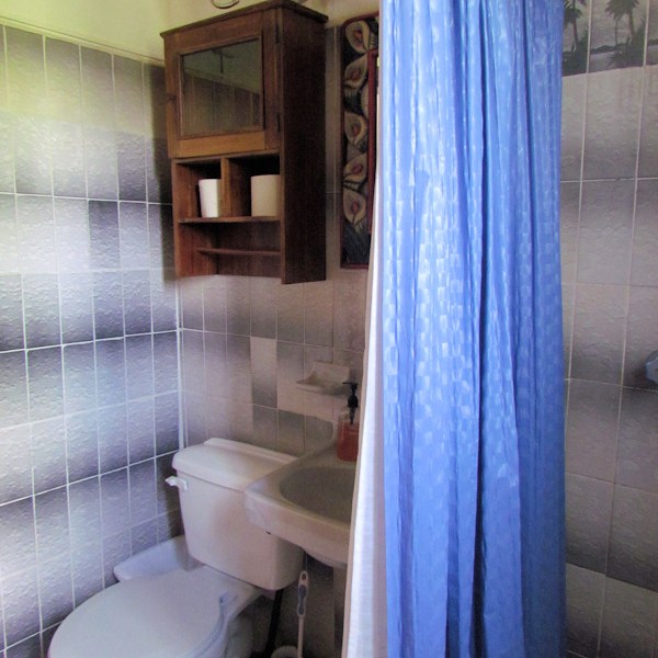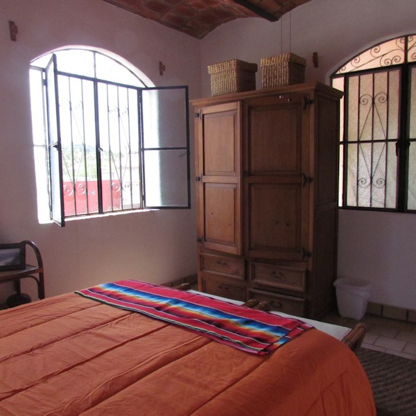 Casa Amistad is a two-story duplex, with off-street secure parking. The upper unit sleeps 2 in a one bedroom layout, with a smartly decorated living room…including a queen-sized futon that sleeps 2. The unit is comfortably furnished and opens onto a large sheltered balcony that is bathed with wonderful ocean breezes. The balcony is a perfect spot for a hammock between the span of it’s large open arches. The upper unit also has access to the living space on the roof, with unobstructed views of the sunrise over the mountains to the east. Our renters favor the open-space for morning coffee while listening to the birds singing across the village. Sunsets can also be remarkable from the roof, with wide-open views of the stars in the dark night sky above.